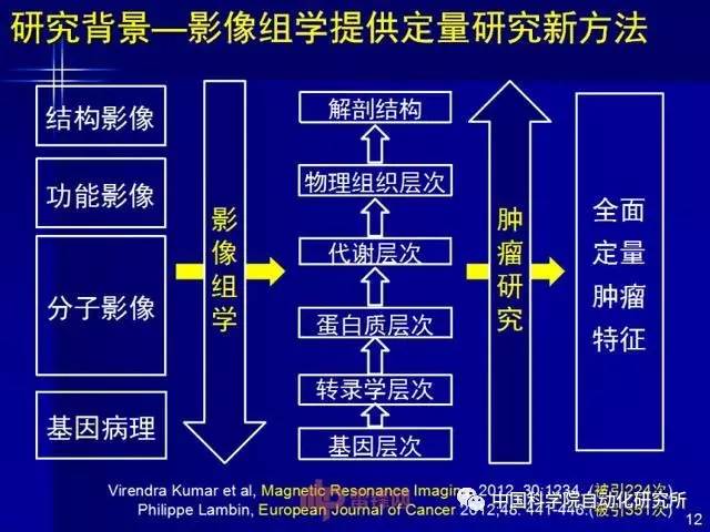 现在的影像技术是从宏观到微观,先有结构影像再到功能影像、分子影像,它的精标准正好是基因病理。而从基础研究来说,恰恰是从微端到宏观,当在基因组、蛋白组、代谢组都搞不定的时候,又回到生物医学,使用解剖结构。所以一个是从微观到宏观,另一个则是从宏观到微观,如果将二者结合到一起,就有可能进行肿瘤的诊疗。这也是整个影像组学的切入点。