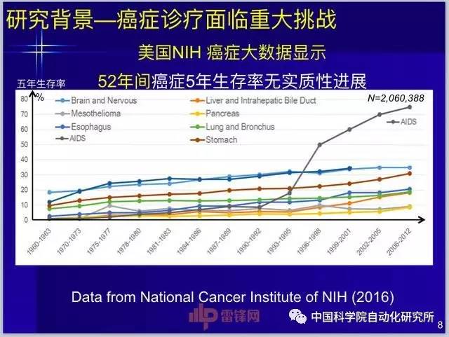 肿瘤的应用挑战主要看如上这张图,这是美国NIH总结的。1960年-2012年,52年中有200多万的样本大数据。不同颜色的线代表不同的肿瘤,纵坐标是5年生成。