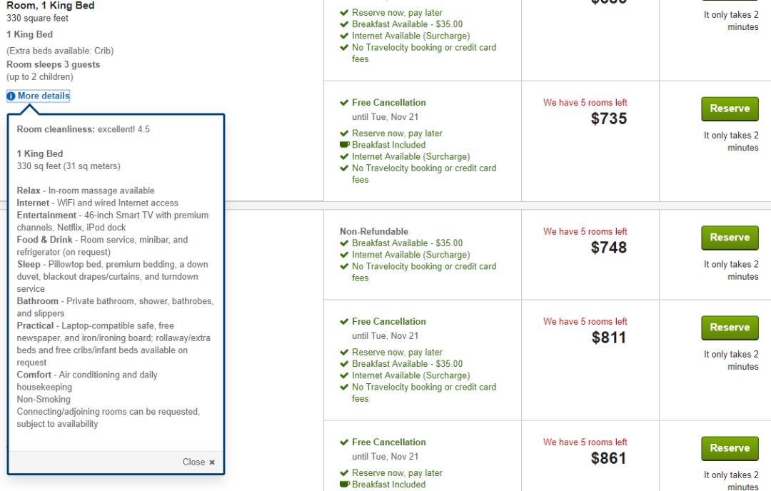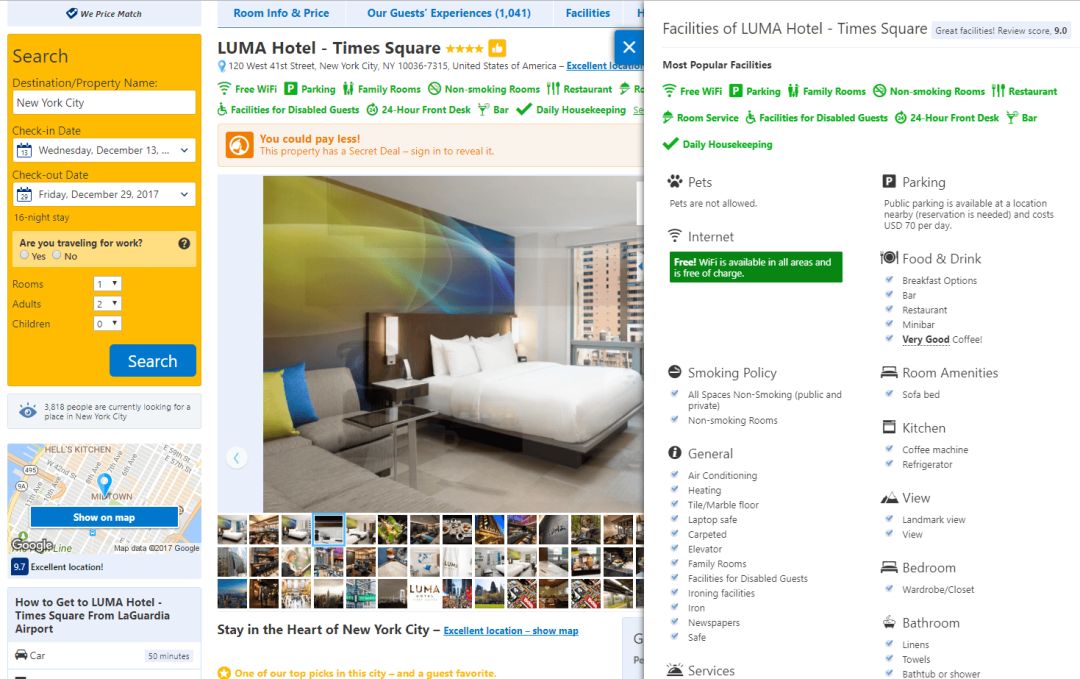 在酒店主页上,用户可以查看房间照片,了解相关信息,包括可否带宠物、入住和退房时间、评论、最近的地标和餐馆等等。