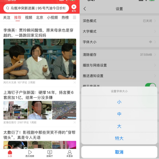 这一点我们可以向今日头条学习,今日头条产品设计本身非常很简洁。针对于一些老年人的特殊需求,它选择在设置增加调节字体大小的功能。