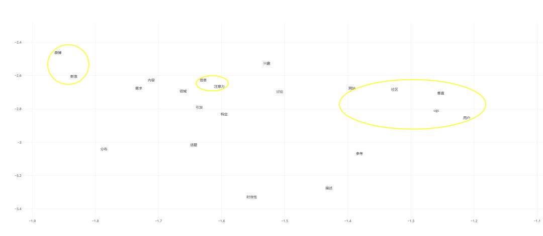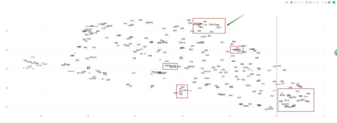 将箭头指向区域的词汇簇群放大,可视化效果如下所示(点击图片放大看高清大图),从中我们可以看到上述提到的、基于当前语境(这10篇参与训练、涉及社会化营销、social listening的文章)下的词汇聚合关系和组合关系: