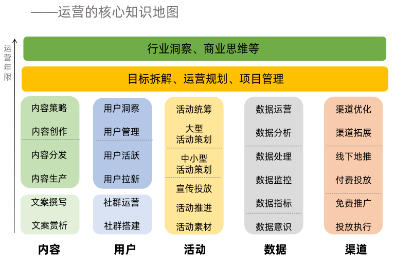在一个完整的项目中,我们要有内容、用户、活动、数据、渠道方面的运营能力,再进一步我们也需要进行规划和管理,以及行业洞察等等。