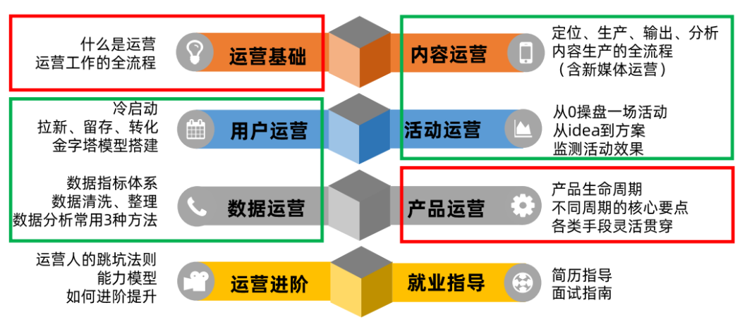 其中包含8大知识板块【运营基础、内容运营、新媒体运营、用户运营、活动运营、数据运营、产品运营、运营进阶】以及【就业指导与职业发展】;每个版块都按照【基础-提升-进阶-实操】4个流程稳固学习!