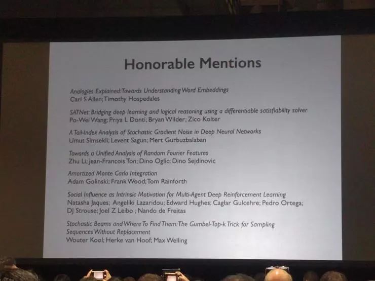 同期,ICML 2019 也公布了 7 篇摘得提名奖(Honorable Mentions)的论文,分别如下: