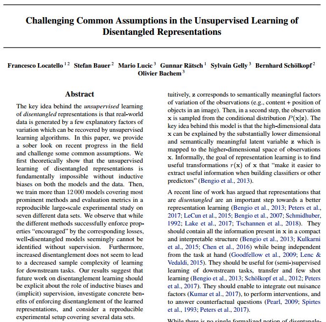 论文作者:Francesco Locatello, Stefan Bauer, Mario Lucic, Gunnar Rätsch, Sylvain Gelly, Bernhard Schölkopf, Olivier Bachem