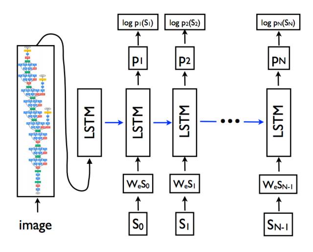 这种模型的基础是将图像编码成紧凑的表征的卷积神经网络,后面跟着一个循环神经网络来生成对应的句子。这种模型的训练目标是最大化给定图像的句子的似然。