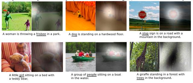 我们还通过可视化展示了模型在生成输出序列中对应的词时自动学习关注突出对象的方式。