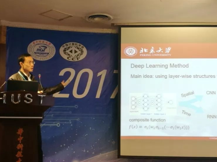 (6) 北京大学王立威教授作了题为「Towards Understanding Deep Learning」的特邀报告。王教授介绍了对于深度神经网络,由于模型参数远大于训练数据模型,基于复杂性的学习理论无法解释其良好的泛化性能,而 Stochastic Gradient Langevin Dynamics (SGLD) 方法有极强的泛化能力,可以部分解释深度学习中的一些现象。