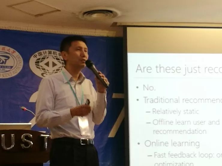 (2) 微软亚洲研究院的高级研究员陈卫博士作了题为「Combinatorial Online Learning」的特邀报告。陈卫研究员以组合多臂老虎机为例,介绍了他与他的合作者提出的将优化任务与非线性目标函数和近似保证相结合的有紧的 regret 界的通用框架。