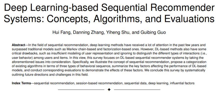 近年来,随着深度学习技术的发展,越来越多的领域尝试使用深度学习方法来解决问题。本周介绍一篇有关深度学习序列推荐系统的综述《Deep Learning-based Sequential Recommender Systems: Concepts, Algorithms and Evaluations》。