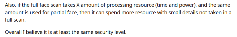 有关芯片的猜测,Reddit的果粉板块上,有人说得很有道理:「如果全脸扫描识别需要使用一定量的时间、算力等处理资源,然后处理部分脸部扫描识别的还是同等量资源的话,那么算法必定要在识别全脸扫描时忽略的小细节上投入更多算力。」