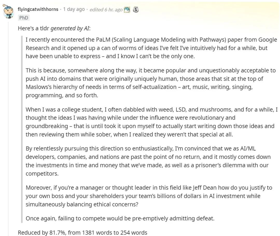 对于人工智能抹杀人类创造能力的担忧或许有其道理。不过现代社会,说的太多就意味着没人愿意看,于是热心网友用 AI 的文本总结功能对这段话进行了摘要。