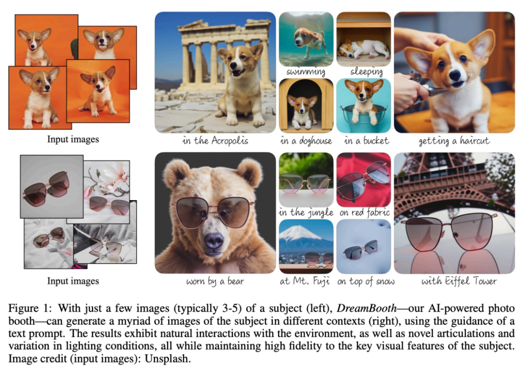 具体来说,该研究将给定主题的图像植入模型的输出域,以便可以使用唯一标识符对其进行合成。为此,该研究提出了一种用稀有 token 标识符表示给定主题的方法,并微调了一个预训练的、基于扩散的文本到图像框架,该框架分两步运行;从文本生成低分辨率图像,然后应用超分辨率(SR)扩散模型。