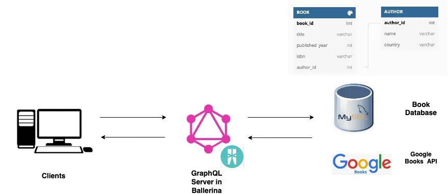MySQL 数据库中保存了与书店相关的数据,包括书籍和作者的信息。与书籍相关的其他信息通过 Google Books API 获得。书店的客户端可以通过 GraphQL API 完成以下这些操作: