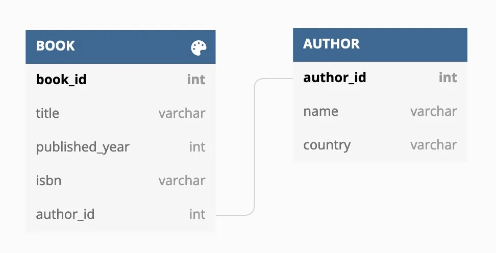 首先用示例数据填充 MySQL 数据库。Bookstore 数据库有两张表,“Book”和“Author”,包含以下这些字段。