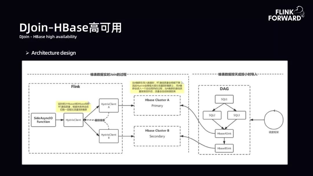 DJoin-HBase 高可用:维表数据达到T级别时使用 HBase 进行数据存储。HBase 高可用性采用双 HBase 集群,Failover AB 模式。这时需要考虑两个问题。第一是数据更新机制。数据更新可以是按小时或按天,采用 HFile BulkLoad 模式,串行+ Interval 间隔导入,导入后同步数据预热,以此保证两套HBase 集群的稳定性。第二是数据查询机制。引入 Hystrix 实现服务熔断、降级回退策略。当 A 集群可用性下降时,根据 AB 的 RT 质量,动态切换一定数据到B集群,以保证数据流量均衡。