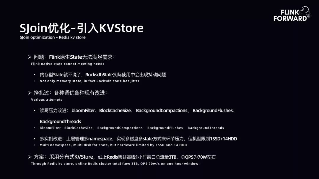 SJoin 优化-引入 KVStore:Flink 原生 State 无法满足要求,在对 Value、IO 要求高时抖动严重,RocksDBState 实际使用中会出现抖动问题。对此,bilibili 尝试过多种改进方案。开 1 小时窗口,数据量约 700G,双流 1 小时窗口总流量达到 TB 级别。采用分布式 KVStore 存储,后续进行压缩后数据量约 700G。