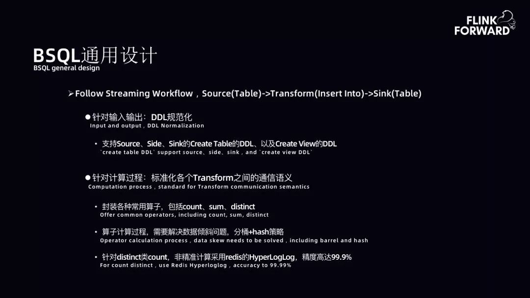 BSQL 通用设计:BSQL 是遵照 Streaming workflows 设计的思想,核心工作围绕 Source、Transform 以及 Sink。Transform 主要依托 Flink SQL,所以 BSQL 更多是在 Source 和 Sink 上进行分装,支持 DDL 的分装。此处 DDL 参照阿里云对外资料进行了扩展。另外,BSQL 针对计算过程进行了优化,如针对算子计算的数据倾斜问题采取分桶 + hash 策略进行打扫。针对 distinct 类 count,非精准计算采用 Redis 的 HyperLogLog。