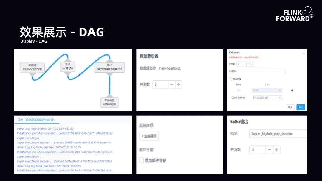 效果展示-DAG:如下图所示,DAG 产品展示,包括并行度的设计、日志、监控指标告警输出。