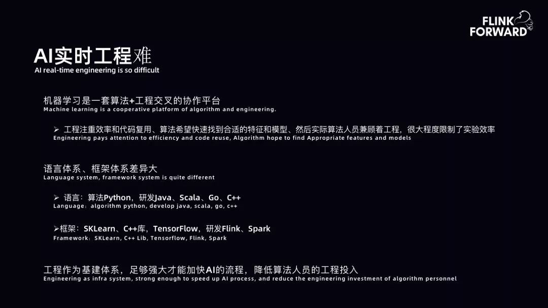 AI 实时工程难:bilibili 客户端首页推荐页面依靠 AI 体系的支撑,早期在 AI 机器学习方面遇到非常多问题。机器学习是一套算法与工程交叉的体系。工程注重的是效率与代码复用,而算法更注重特征提取以及模型产出。实际上 AI 团队要承担很多工程的工作,在一定程度上十分约束实验的展开。另外,AI 团队语言体系和框架体系差异较大,所以工程是基建体系,需要提高基建才能加快 AI 的流程,降低算法人员的工程投入。