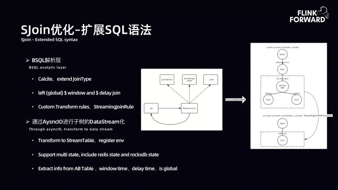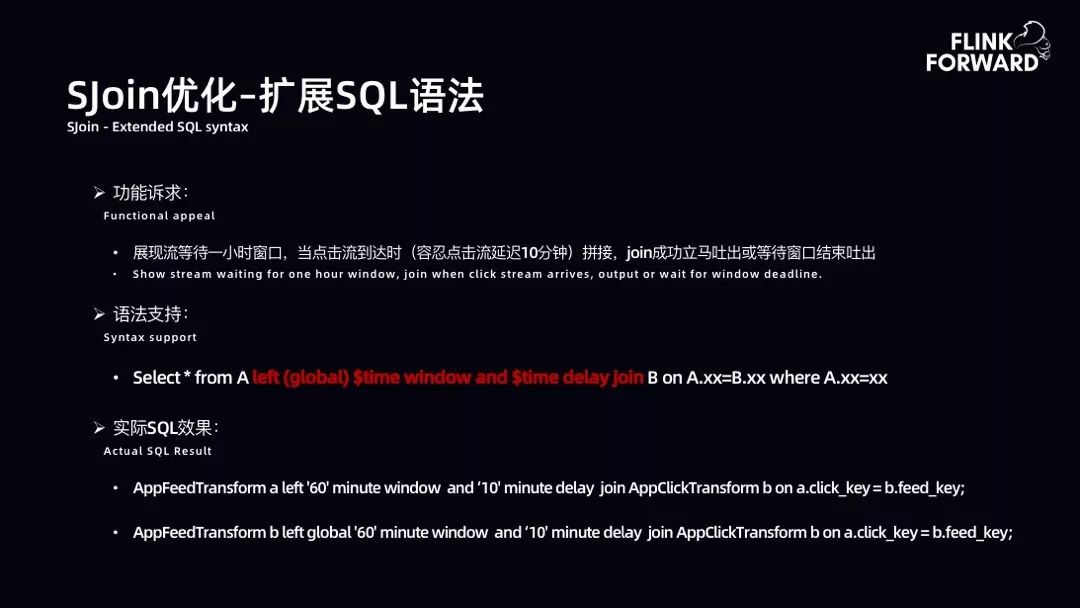 SJoin 优化-扩展 SQL 语法:扩展 SQL 的功能诉求是展现流等待 1 小时窗口,当点击流到达时,不立即吐出 Join 完成的数据,而等待窗口结束后再吐出。故扩展了 SQL 语法,虽然目前未达到通用,但是能满足诸多部门的 AI 需求。语法支持 Select * from A left(global)$time window and $time delay join B on A.xx=B.xx where A.xx=xx。给用户带来了很大收益。