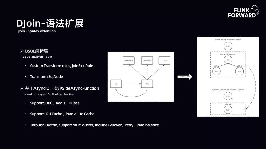 DJoin-语法扩展:DJoin 语法扩展与 SJoin 语法扩展类似,对 SQL 树子树进行转化,通过 AsyncIO 进行扩展,实现维表。