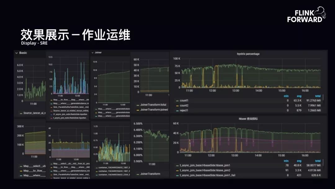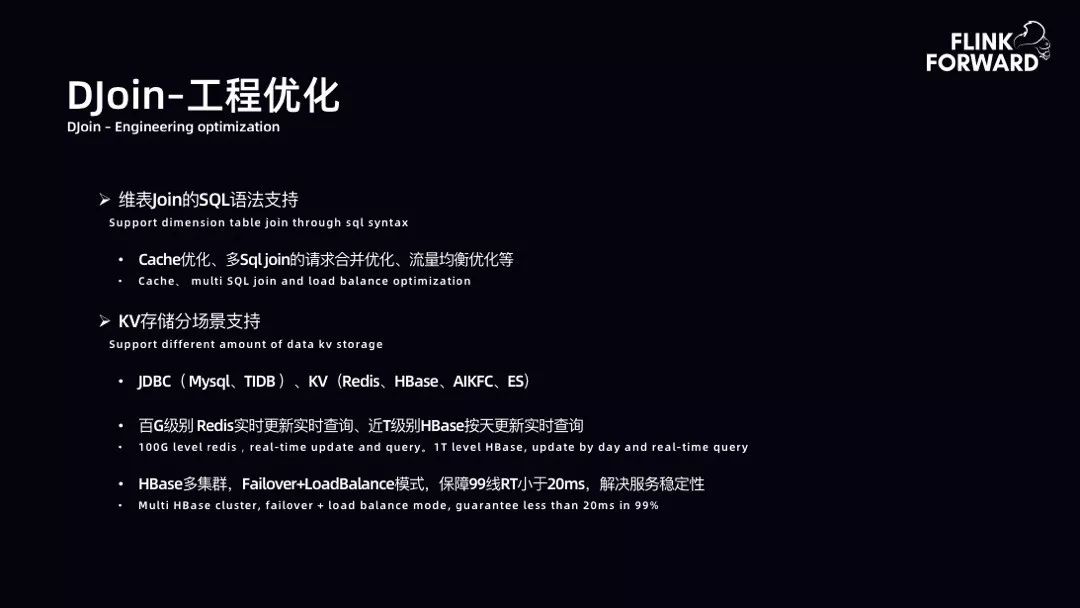 DJoin-工程优化:需要针对维表 Join 的 SQL 进行语法支持。包括 Cache 优化,当用户写多条 SQL 的维表 Join 时,需要提取多条 SQL 维表的 Key,并通过请求合并查询维表,以提高 IO,以及流量均衡优化等。第二,KV 存储分场景支持,比如 JDBC、KV。KV 场景中,对百 G 级别使用 Redis 实时更新实时查询。T 级别使用 HBase 多集群,比如通过两套 HBase,Failover+LoadBalance 模式保证 99 线 RT 小于 20ms,以提高稳定性。
