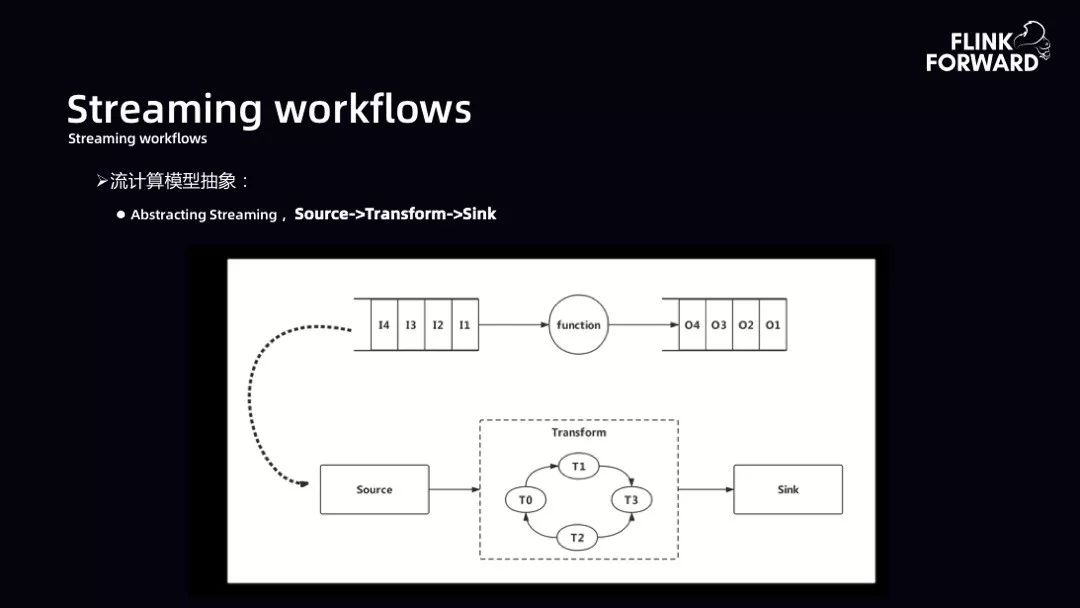 Streaming workflows:下图为流计算模型抽象。大数据计算引擎的本质是数据输入经过一个 function 得到输出,所以 function 本质是一个能够做 DAG 转换的 Transform。Saber 平台期望的流计算抽象形态是提供相应的 Source,计算过程中是一个 Transform 的 DAG,最后有一个 Sink 的输出。