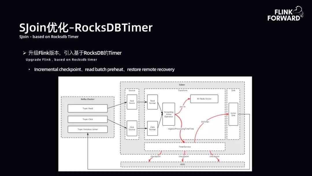 SJoin 优化-RocksDBTimer:升级 Flink 版本,引入基于 RocksDB 的 Timer。升级后架构如下图所示。数据从 Kafka 获取 Topic-Feed 和 Topic-Click,首先对其进行一层清洗,然后进入自定义的 Joiner Operator 算子。算子做两件事,将主流数据吐到 Redis 中,由 Redis 做 State,同时将需要开窗口的 Key 存储注册到 Timer Service 中。接下来利用 Timer Service 原生的 CheckPoint 开启增量 CheckPoint 过程。当 OnTimer 到达时间后,就可以吐出数据。非常此方案契合 SJoin 在高吞吐作业下的要求。