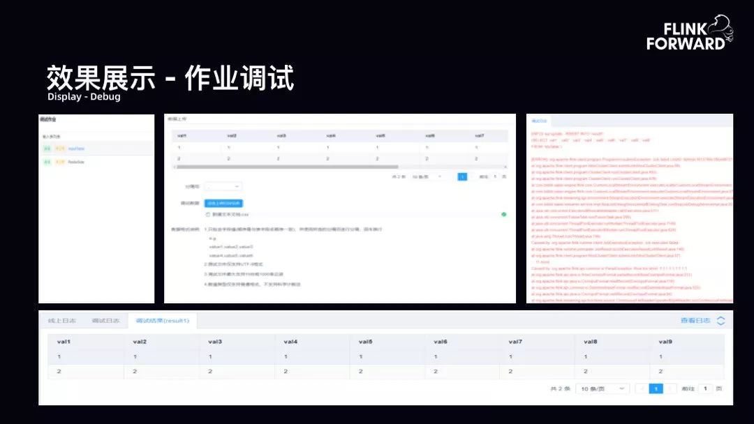 效果展示-作业调试:如下图所示为平台支持的作业调试。如果只有 SQL 开发却没有作业调试环节,是令用户痛苦的。故平台支持通过文件上传的方式以及线上采样的方式进行作业调试 SQL。