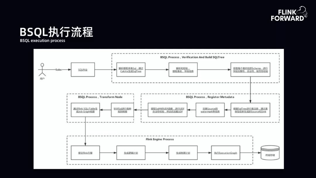 BSQL 执行流程:用户提交 SQL,BSQL 首先进行验证并构建 SQL 树。验证与构建主要是提取表名、字段信息,从元数据库中提取 schema 验证 SQL 的规范性、完整性和合法性。验证完成后,将输入表和结果表注册到 Flink 的运行时态,其中还包括 UDF 和 watermark 信息的完善。另外,平台对 SQL 有一些扩展。第三块是扩展的核心工作,将 SQL 树中扩展的子树转换为新的节点,然后将 SQL 的 DAG 提交到 Flink 上运行。