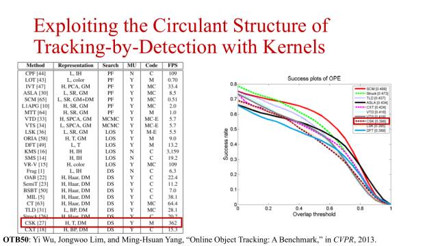 这是在CVPR2013 benchmark工作上给出的性能分析,当时就已经发现基于相关滤波的目标跟踪很有潜力,速度非常快,性能也不错。在性能最好的十个跟踪方法中该方法最快,在速度上具有一个数量级的优势。