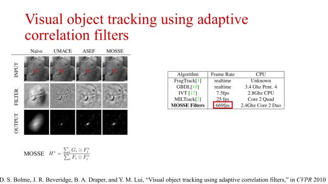 这篇CVPR2010的工作最早将相关滤波器运用在目标跟踪任务上,这个方法是从信号处理的角度来进行推导的,叫误差最小平方和滤波器(MOSSE)。