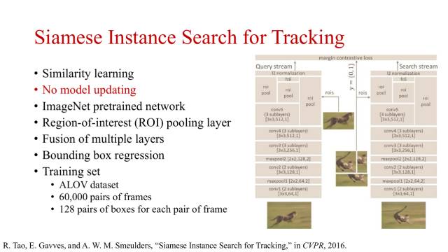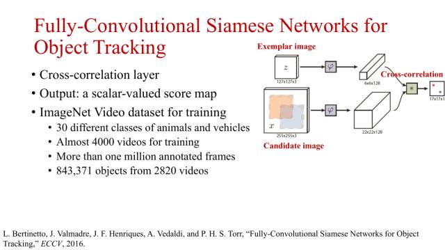 CVPR2016上提出了一种通过相似性学习的方式进行目标跟踪的孪生网络。其最大的特点是,该方式训练好的网络直接在跟踪上使用,不需要更新。网络同样采用了不同层的特征融合和边框回归来提升目标跟踪的性能。