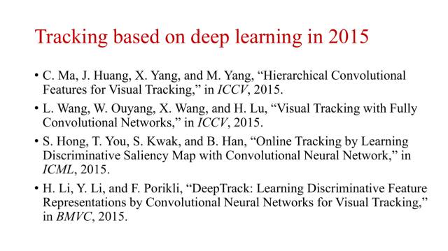 随着深度学习的火热,从2015年开始,利用深度学习进行目标跟踪的研究工作越来越多。