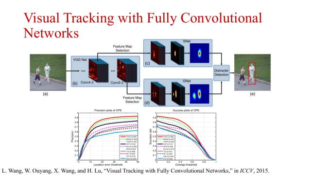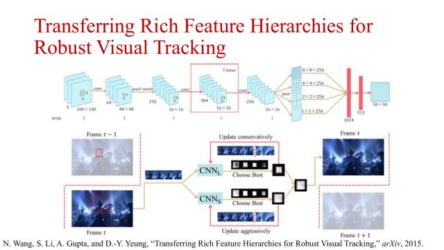 在2015年,王乃岩继续将卷积神经网络运用到目标跟踪任务中,采用卷积神经网络输出50*50的heatmap来表示每个像素是否处于目标之内的概率。卷积神经网络模型运用的是ImageNet数据集预训练的模型,然后在线进行更新,跟踪时运用两个卷积神经网络,采用不同的更新策略。