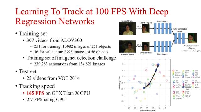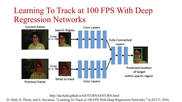 在ECCV2016上还有一个采用深度回归网络进行目标跟踪的工作,与目标检测中基于回归方法的卷积网络有些类似,这个方法直接对目标位置进行回归。