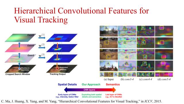 马超在ICCV2015的工作是将卷积神经网络中不同层的特征图结合起来,在相关滤波框架下进行跟踪。