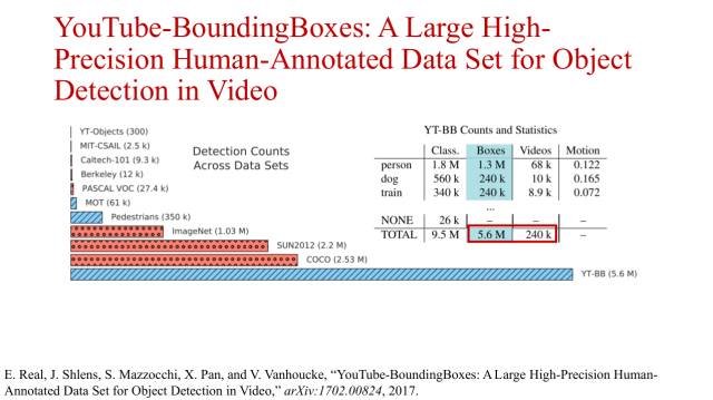 以及Google发布的YouTube-Bounding Boxes数据集,该数据集适用于在视频的目标检测任务、以及目标跟踪算法的训练和测试。