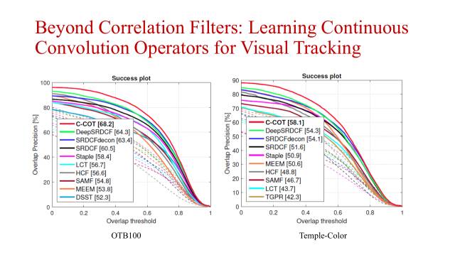 该模型在OTB100上取得非常好的结果,相比MDnet而言,无论是精度还是速度都有了很大的提高。即使只采用传统的视觉特征,也可以达到很好的性能。