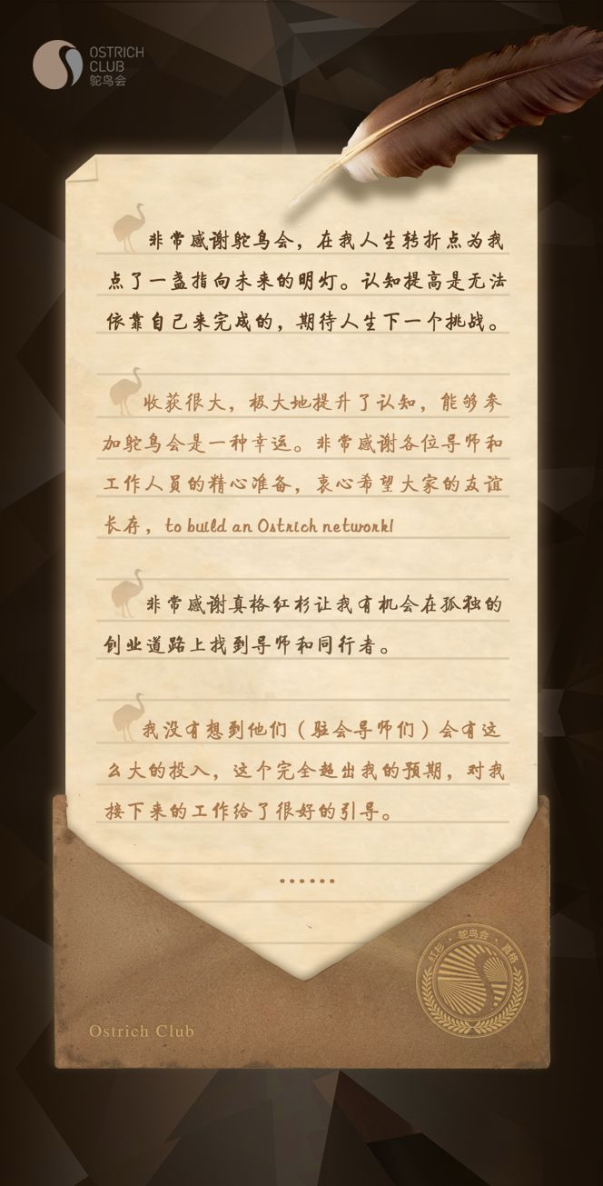 创立至今,鸵鸟会已经举办了两期,集结了从3715位申请者中录取的31名终身会员。在这个会员与导师紧密连结、迸发创业灵感、提供创业支持的俱乐部里,大家遇到引路人、结交同行者,更有准备地踏上创业征途。