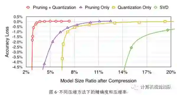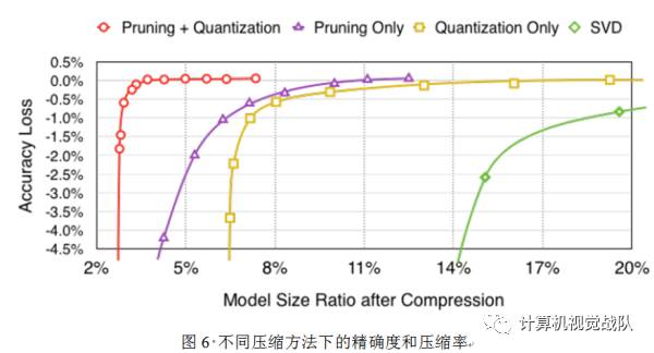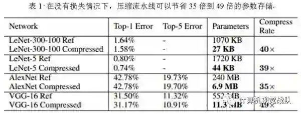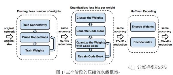 神经网络是计算密集型和内存密集型,很难使它们用有限的硬件资源去部署在嵌入式系统中。为了解决这种限制,本文引入“深度压缩”,一共有三个阶段的流水线:剪枝、量化和霍夫编码,它们一起工作去减少神经网络的存储问题,并在没有影响精确度的情况下压缩了35倍到49倍。最后在ImageNet数据集上的实验结果,将AlexNet压缩了35倍(从240MB压缩到6.9MB)并没有精确度损失;将VGG-16压缩了49倍(从552MB压缩到11.3MB),也没有精确度损失。