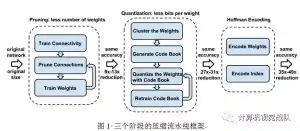 网络剪枝已经被广泛研究于压缩CNN模型。在早期工作中,网络剪枝已经被证明可以有效地降低网络的复杂度和过拟合。如图1所示,一开始通过正常的网络训练学习连接;然后剪枝小权重的连接(即所有权值连接低于一个阈值就从网络里移除);最后再训练最后剩下权值的网络为了保持稀疏连接。剪枝减少了AlexNet和VGG-16模型的参数分别为9倍和13倍。