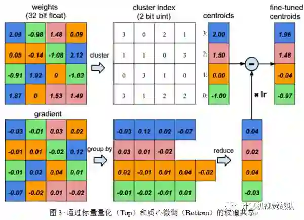 假设有4个输入神经元和4个输出神经元,权值就是一个矩阵。在图3的左上角是一个权值矩阵,在左下角是一个梯度矩阵。权值被量化到4 bits(用4种颜色表示),所有的权值在相同的通道共享着相同的值,因此对于每一个权值,只需要保存一个小的索引到一个共享权值表中。在更新过程中,所有的梯度被分组,相同的颜色求和,再与学习率相乘,最后迭代的时候用共享的质心减去该值。