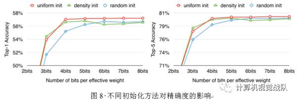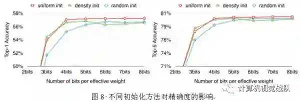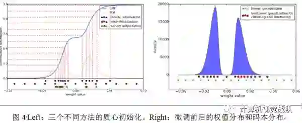 较大的权值比较小的权值有着更重要的角色,但是较大的权值很少。因此,Forgy和density-based初始化很少有大的绝对值,这就导致较少的权值被微弱表达。但是Linear初始化没有遇到这个问题,实验部分比较了准确性,发现Linear初始化效果最好。