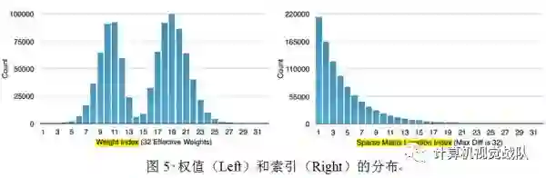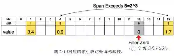 为了进一步压缩,本文存储不同索引而不是绝对的位置,然后进行编码,8 bits用于卷基层,5 bits用于全连接层。当需要的不同索引超过所需的范围,就用补零的方案解决,如图2中,索引出现8,用一个零填补。