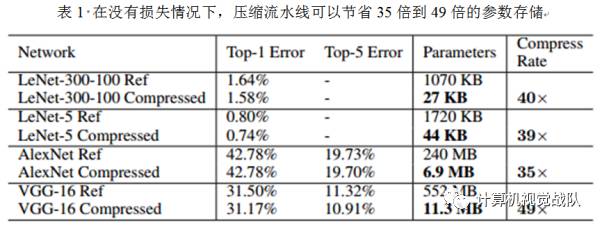 实验一共用了四个网络:2个在MNIST数据集,另2个在ImageNet数据集。该训练用Caffe框架运行,训练时,霍夫曼编码不需要训练,在所有微调结束后实现线下操作。