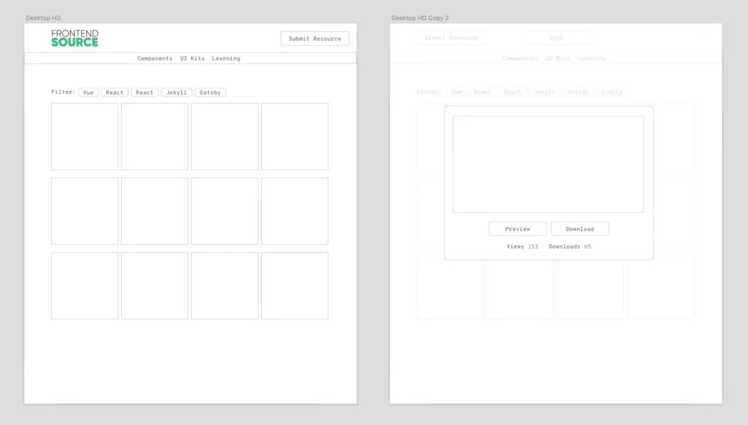 我发现,与其使用一个 modal 组件为每个资源显示下载 / 查看按钮,不如让人们通过在卡片上的悬停覆盖来访问这些 UI。这也是坚持使用线框的一个很好理由,因为我最后甚至没有使用这种设计(节省更多时间)。这个悬停叠加层也能在移动设备上使用,点击卡片即可。