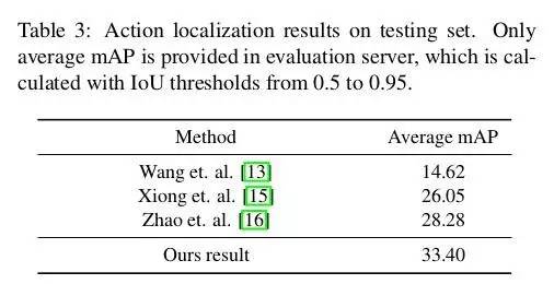 如下表所示是我们的temporal action localization方法在 验证集上的效果。其中Ours@n 代表每个视频使用proposal 集合中的前n个proposal。从表中可以看出,proposal 集合中分数最靠前的一小部分proposal 贡献了大部分的localization mAP。