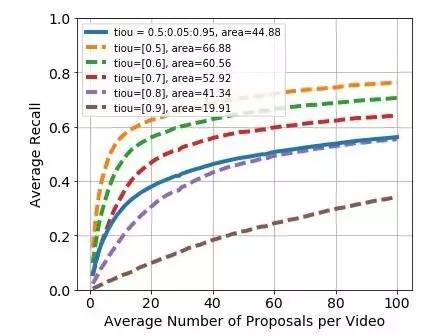 , 该方法得到的proposal的边界相对准确,但由于TAG方法缺乏对于每个proposal的评价,因此该方法在AN 较小时的AR比较差,导致最终的AR-AN 面积指标不高。因此,我们以